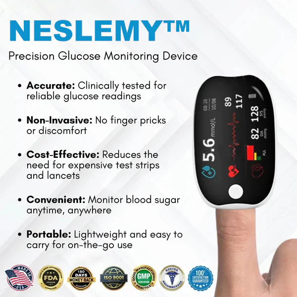 NESLEMY™ is a cutting-edge glucose monitoring solution, rigorously tested and validated by leading healthcare experts, including endocrinologists and specialists from the American Diabetes Association. Endorsed for its exceptional accuracy, reliability, and non-invasive technology, NESLEMY™ meets the highest standards in blood sugar care. Clinical trials have confirmed its ability to deliver readings comparable to traditional methods—without the pain or inconvenience of finger pricks. Its advanced multi-sensor technology ensures precise, real-time glucose monitoring, making it an ideal choice for those seeking a comfortable, effective, and affordable alternative. Endocrinologists particularly recommend NESLEMY™ for frequent, easy tracking without the discomfort or recurring costs of traditional testing. By providing valuable insights into blood sugar trends, it empowers patients and healthcare providers to make informed treatment decisions, promoting better glucose management, improved quality of life, and reduced long-term complications associated with diabetes.